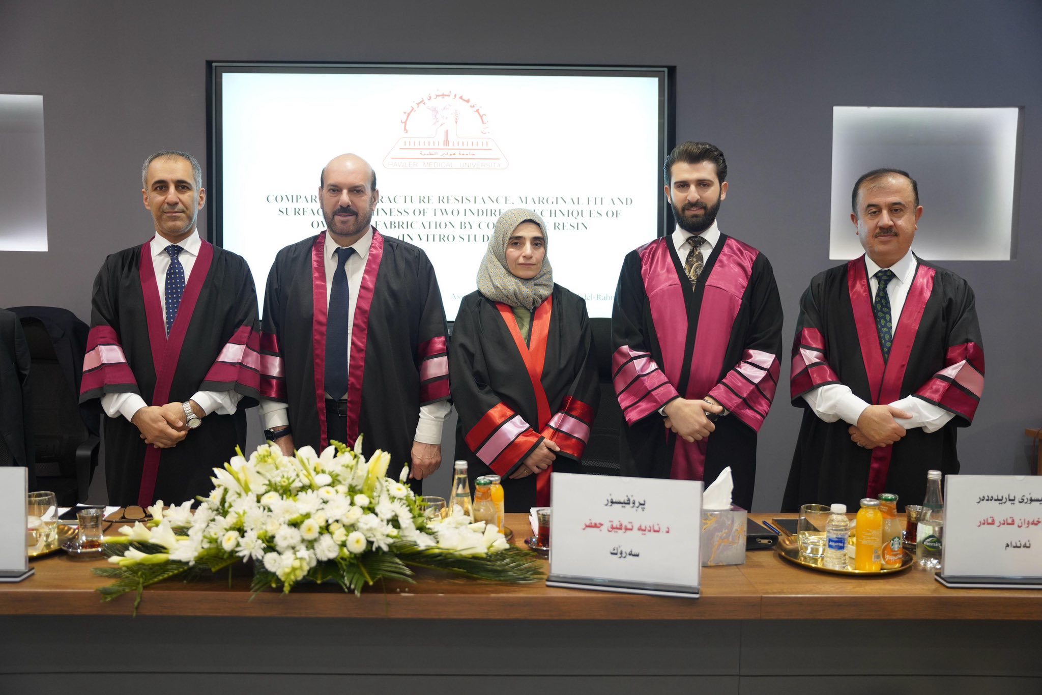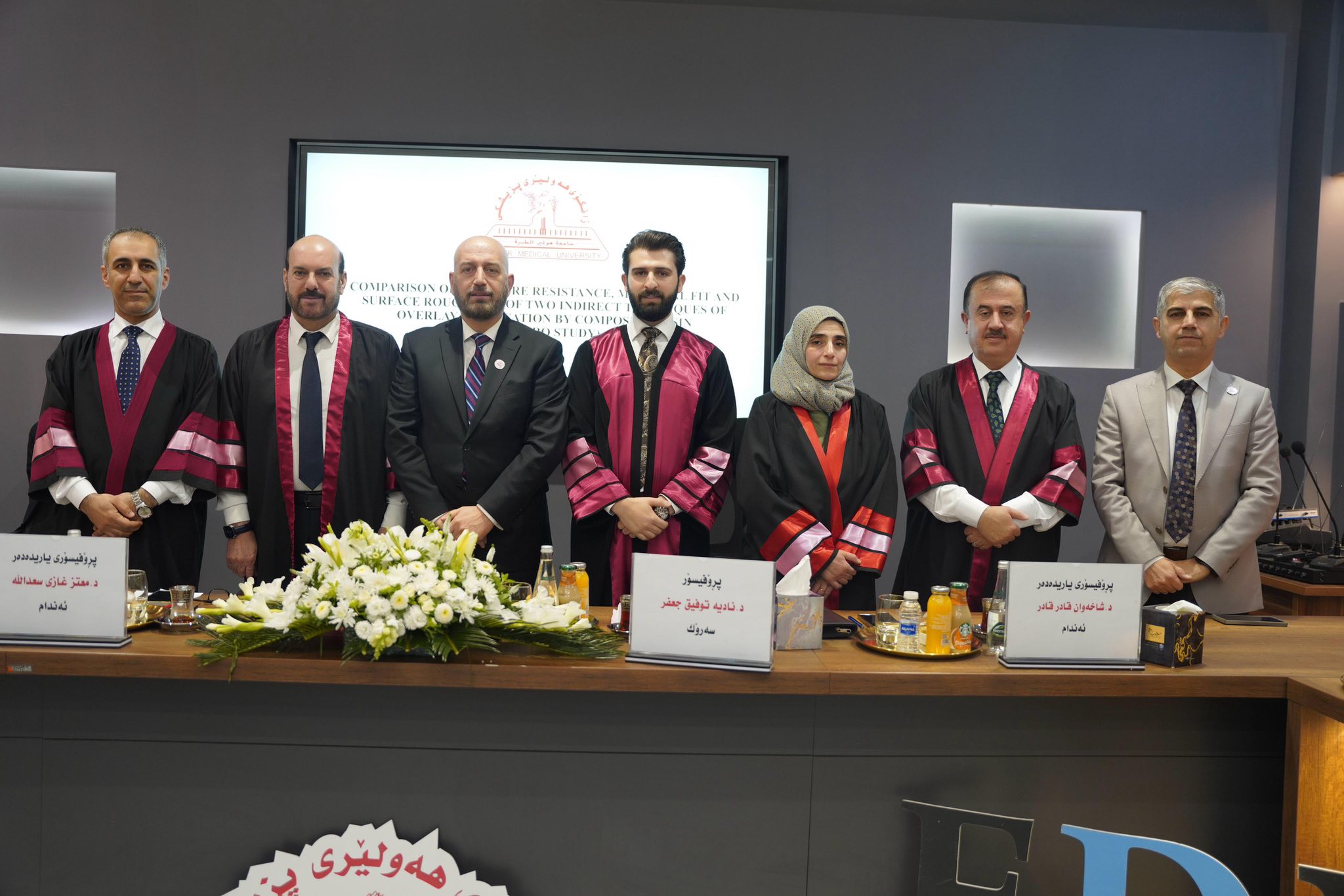 On Thursday, January 15, 2026, at 9:00 AM, the Master’s thesis defense of postgraduate student Amin Najat Ahmed was held at the Dr. Ziwar Qassab Hall in the College of Dentistry.