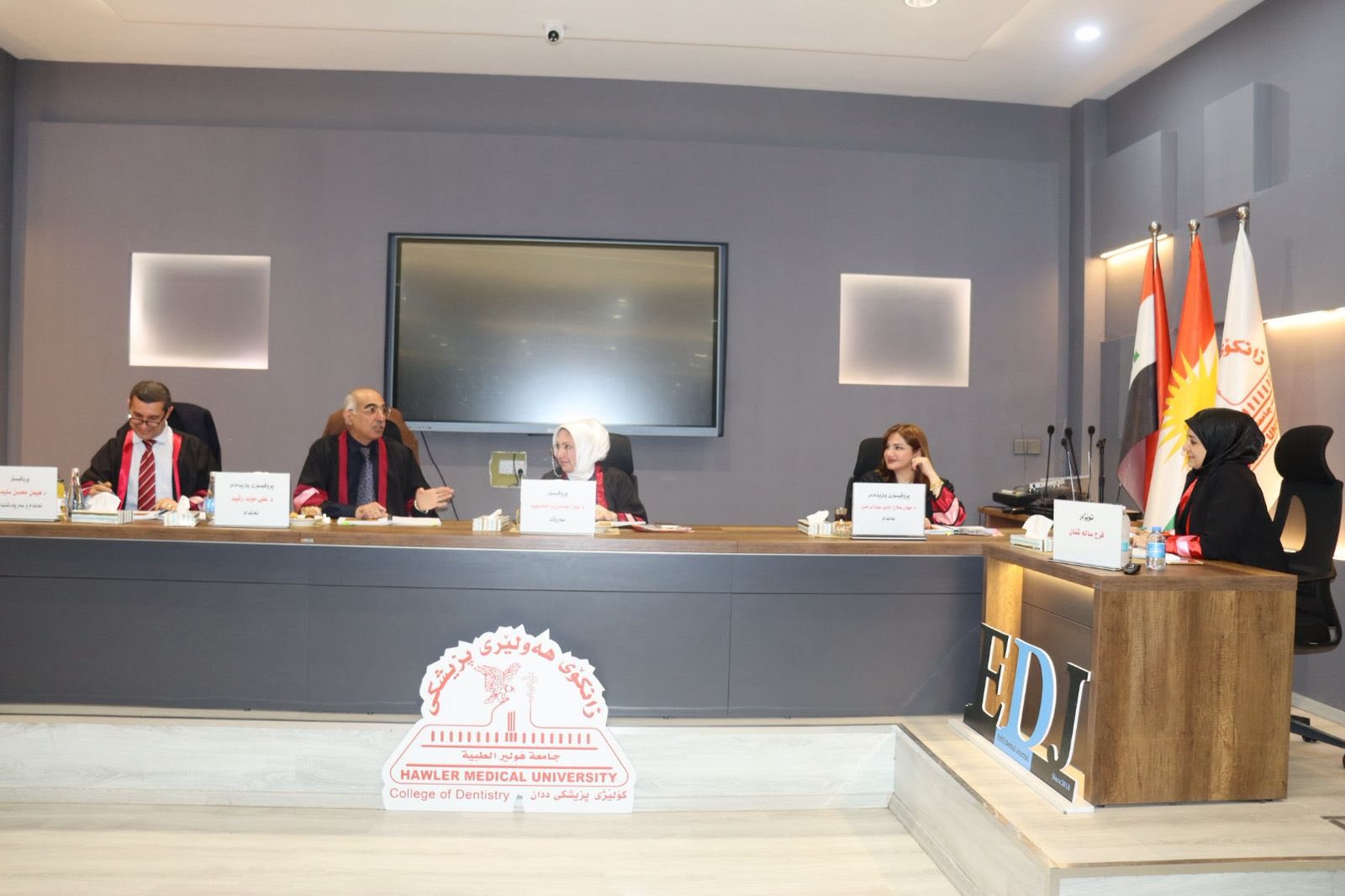 On Thursday, February 12, 2026, at 9:00 AM, the Master’s thesis defense of postgraduate student (Farah Salem Shnan) was held at the Dr. Zewer Qassab Hall in the College of Dentistry. The thesis was titled: