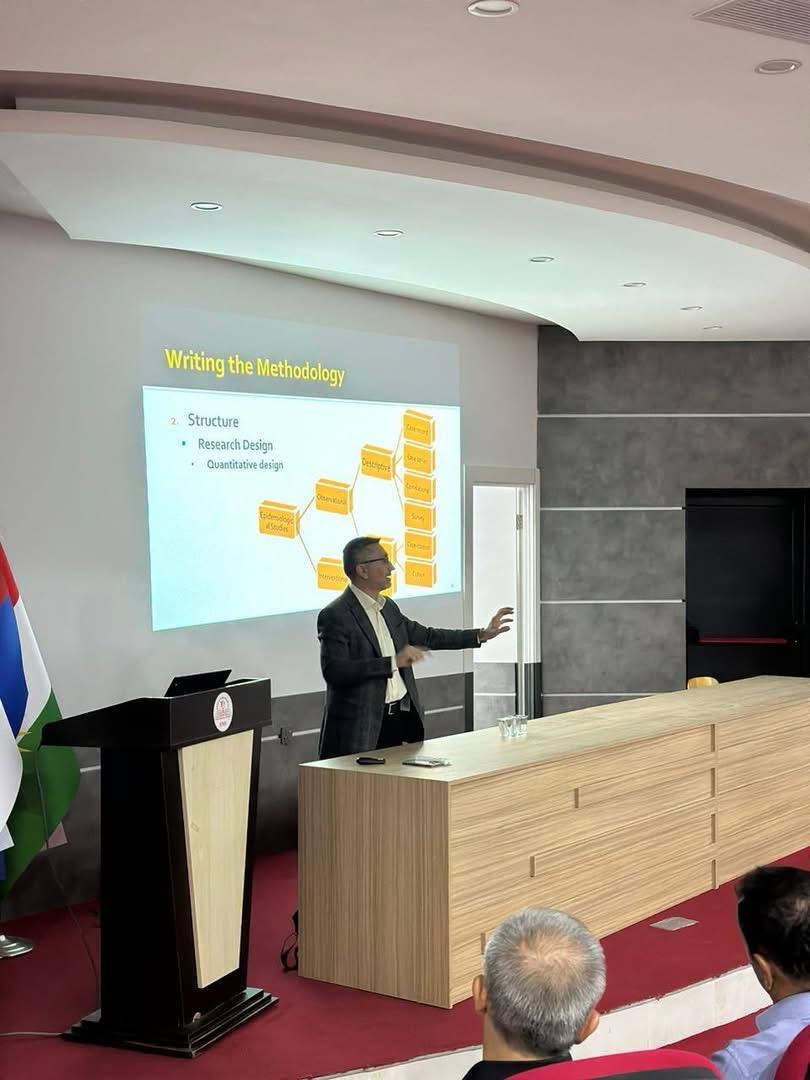 A special seminar titled Research Design and Writing Skills was conducted by Professor Dr. Sherzad Ali for fourth-year students of the Department of Nutrition and Dietetics. The seminar aimed to enhance students’ understanding of research methodology, academic writing, and the preparation of graduation research projects.
