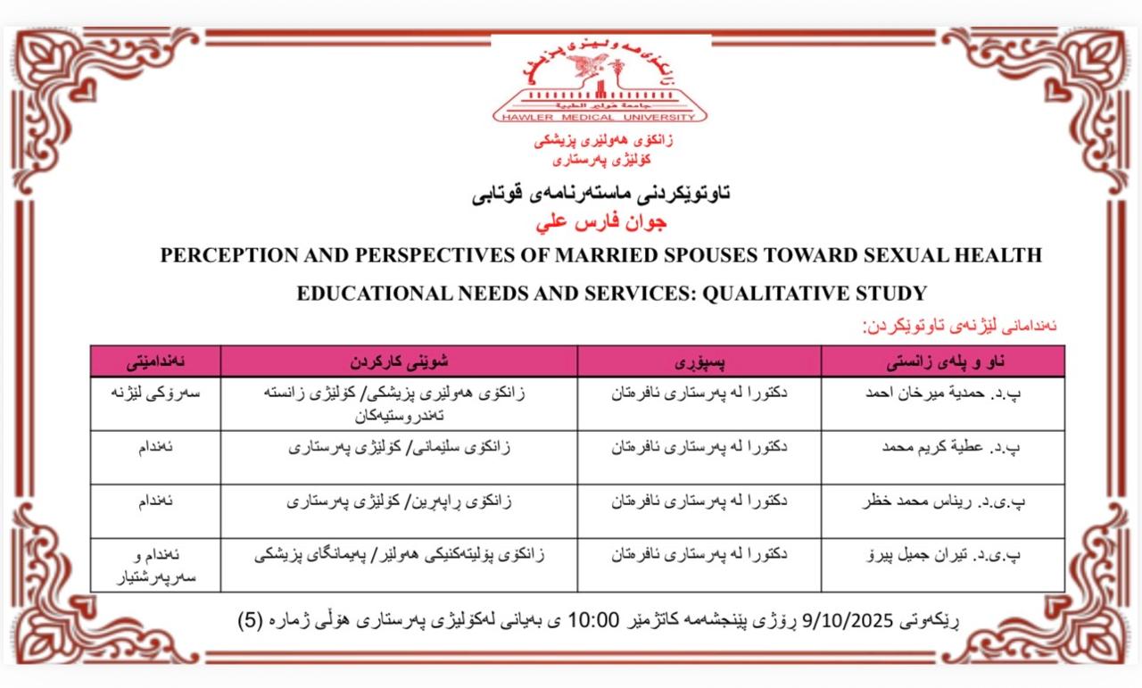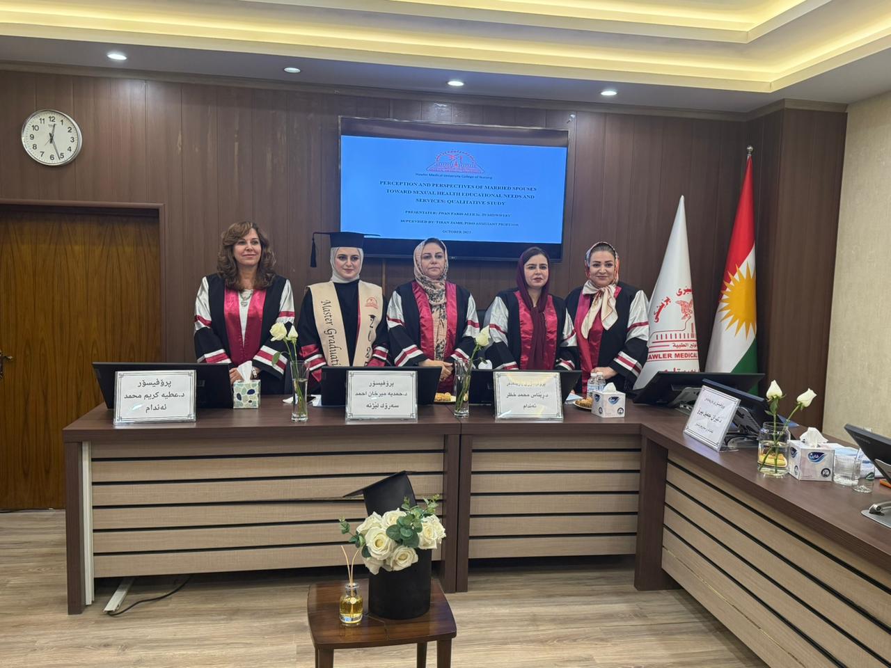 Today on 9-10-2025 the first graduates of our university's master's degree in midwifery at the level of all universities in the Kurdistan Region and Iraq were successfully discussed under the title (Perception and Perspectives of Married Persons Towred Sexual Health Educational Needs and Services in Erbil City: Qualitataive Study).
