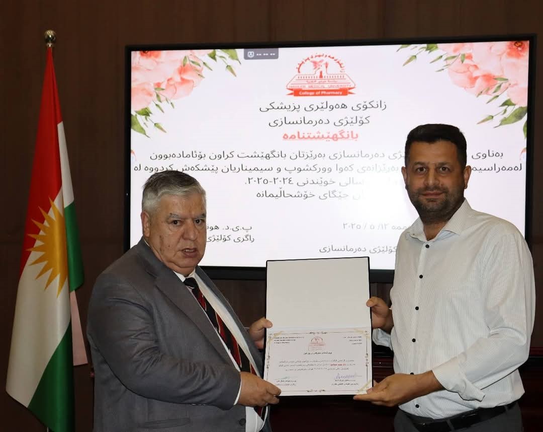 ئەمرۆ دووشەممە بەرواری ١٢/٥/۲٠۲٥ لە هۆڵی سمیناری کۆلێژی دەرمانسازی لە ژێر سەرپەرشتی ڕاگری کۆلێژ بەرێز (پ.ی.د. هونەر کمال گەردی) بە ئامادەبونی بەرێزان (پ.د. نورالدین اسماعیل) سەرۆکی زانکۆی هەولێری پزیشکی و (پ.ی.د. هاورێ مصطفی بکر) یاریدەدەری سەرۆکی زانکۆ بۆ کاروباری کارگێری و دارایی و(پ.د. ژیان دزەیی) یاریدەدەری سەرۆکی زانکۆ بۆ کاروباری زانستی و خوێندنی باڵا و (پ.ی.د. کاروان محمد امین) یاریدەدەی سەرۆکی زانکۆ بۆ کاروباری قوتابیان و سەرۆكی لقە زانستیەکان و مامۆستاو دکتۆرە کانی کۆلێژەکەمان مەراسیمێكی سوپاس پێزانین رێکخرا بۆ رێزلێنان لە مامۆستا و دکتۆرە کانی کۆلێژەکەمان کە لە ساڵی خوێندنی ۲٠۲٤ -٢٠٢٥ بەشێوەیەکی چالاک سیمینارو ووركشوپ و خولی راهێنانیان ئەنجام داوە، ڕۆلی بەرچاویان هەبووە لە بەرزکردنەوەی ئاستی زانستی کۆلێژ و زانکۆکەمان