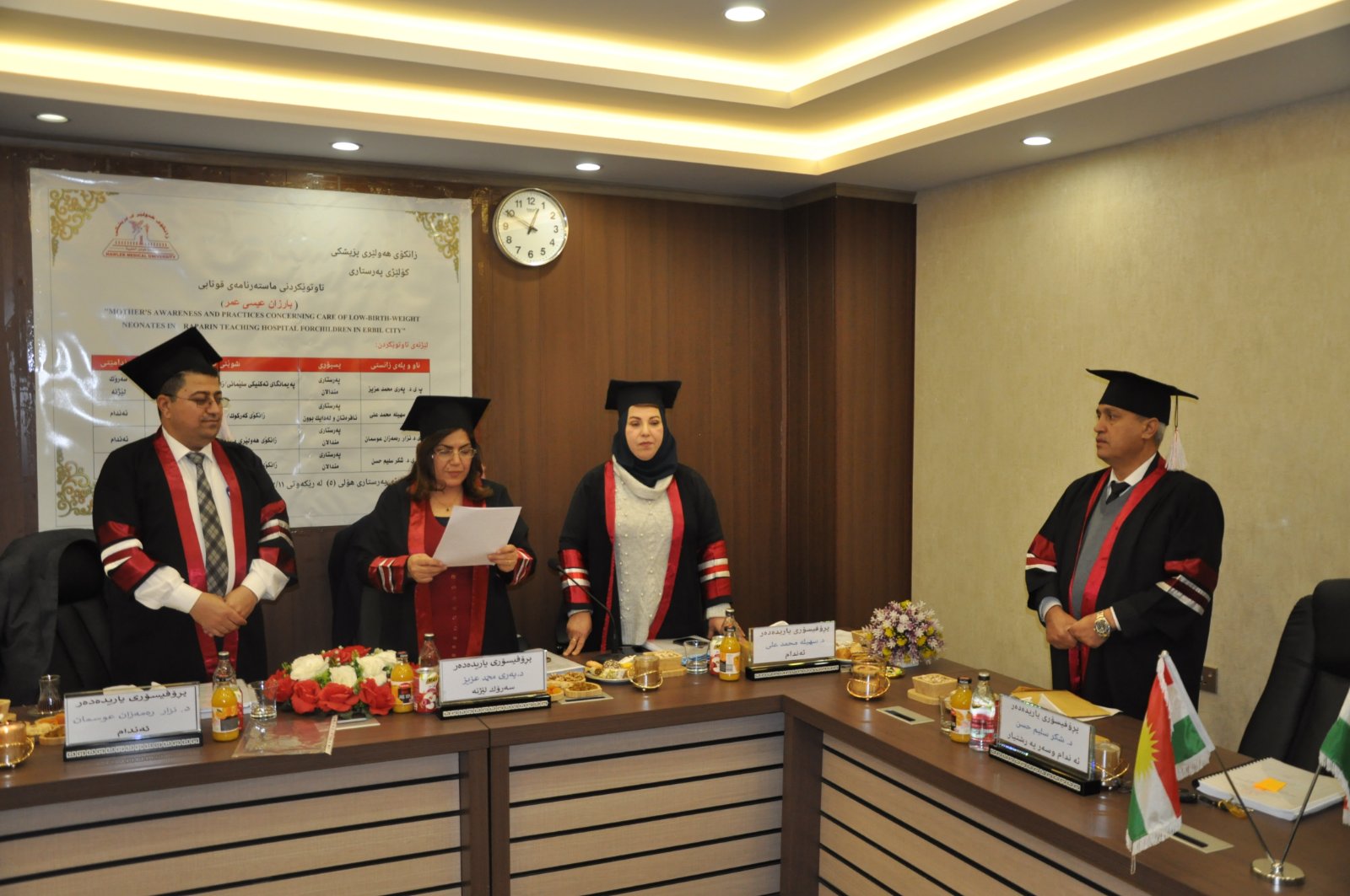 Name of Student: Barzan Issa Omer. Supervisor: Assist. Prof. Dr. Shukir Saleem Hasan. On Saturday dated 11/02/2023, Barzan Issa Omer has defended his Master's Thesis successfully in College of Nursing/Hawler Medical University-Erbil. Barzan has studied the “MOTHER'S AWARENESS AND PRACTICES CONCERNING CARE OF LOW-BIRTH-WEIGHT NEONATES IN RAPARIN TEACHING HOSPITAL FOR CHILDREN IN ERBIL CITY". Moreover, his thesis was accepted as a partial fulfillment for Master Degree in Nursing. It has been suggested to be awarded with Master Degree in his specialty.
