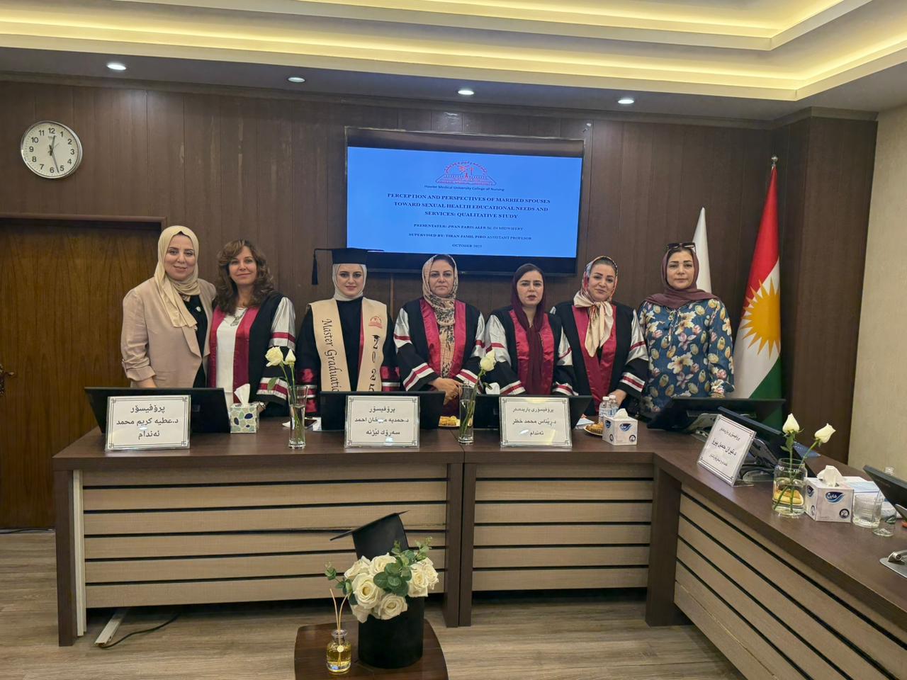 Today on 9-10-2025 the first graduates of our university's master's degree in midwifery at the level of all universities in the Kurdistan Region and Iraq were successfully discussed under the title (Perception and Perspectives of Married Persons Towred Sexual Health Educational Needs and Services in Erbil City: Qualitataive Study).