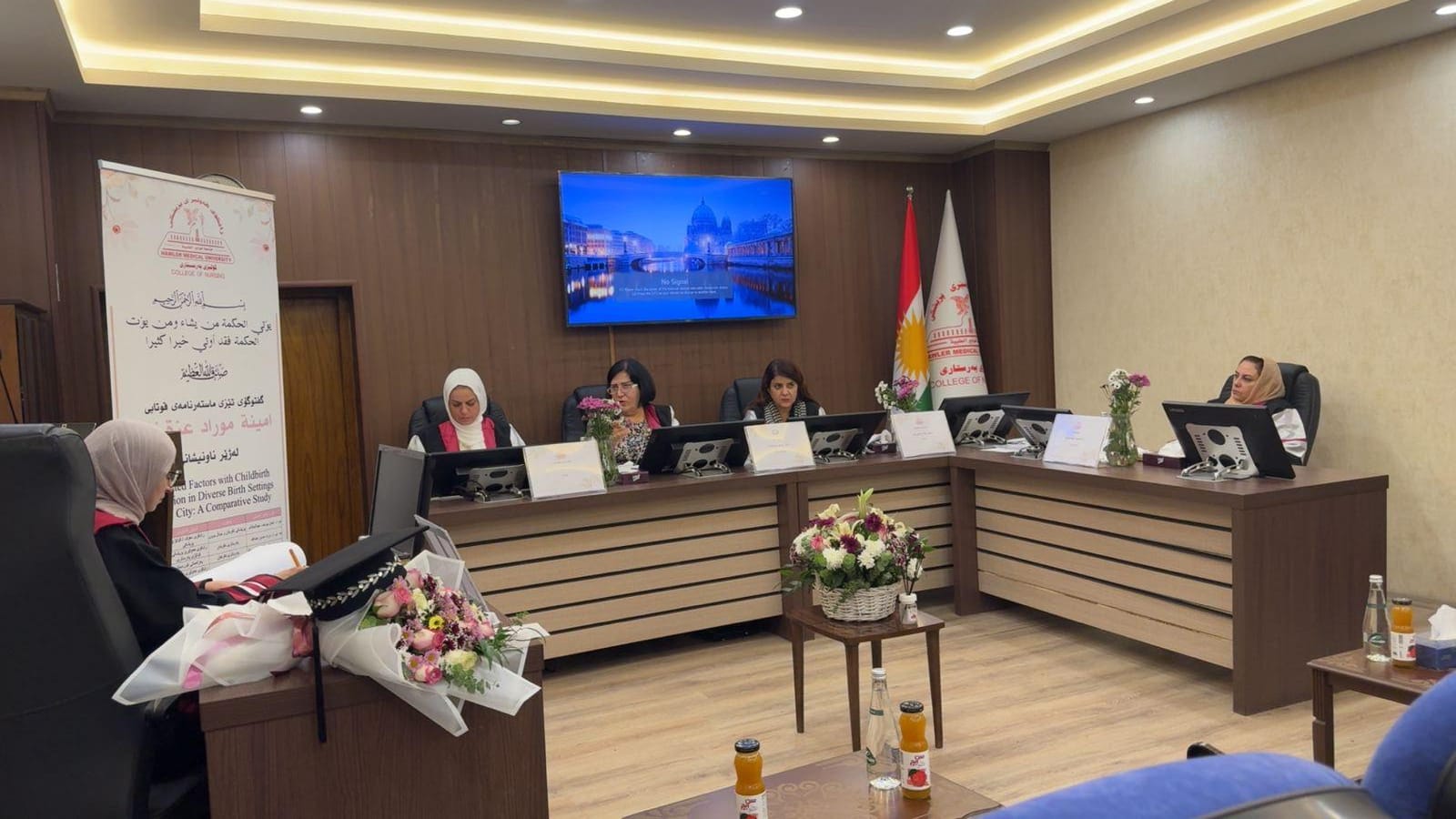 The College of Nursing at Hawler Medical University is proud to extend its heartfelt congratulations to Master’s candidate Amina Murad Izzat Khan on the successful defense of her thesis entitled: